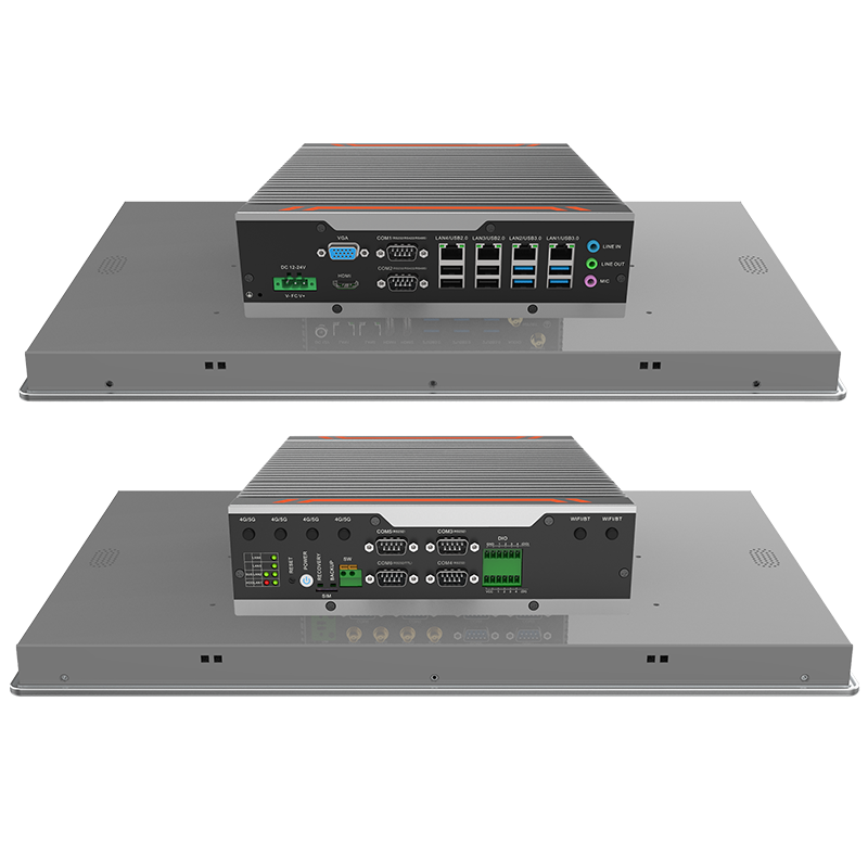 接口丰富:4*LAN(Intel),6*COM,8*GPIO(4*GPI,4*GPO),4*USB3.0+4*USB2.0 1*VGA,1*HDMI,1*远程开关,1*一键还原,1*一键备份,1*SIM槽,1*LINE IN,1*LINE OUT,1*MIC,1*2.5寸硬盘位,1*M.2(KEY-M,2280, SATA SDD),1*M.2(KEYB,3042/3052,USB3.0信号 支持4G/5G模块),1*MINI PCIE(全高,PCIE+USB2信号,支持WiFi/BT)