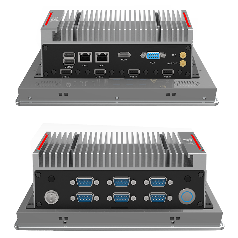 外观设计:铝合金一体成型,工艺精细,科技时尚低功耗:英特尔®赛扬®J1900 板载处理器,TDP 10W稳定可靠:纯工业无风扇设计,大面积铝鳍散热,箱体材质可抗接触式6Kv强电磁干扰;液晶屏接触处加强型密封胶圈设计,面板防水防撞击接口丰富:2*LAN(Intel),6*COM,1*USB3.0,5*USB2.0,1*HDMI,1*VGA,1*MIC In, 1*Line