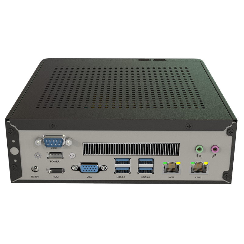 接口丰富:2* LAN, 6*USB,1*USB(电源开关),1*COM RS232, 1* HDMI,1*VGA,支持双屏同步异步显示,1*Audio,1*2.5寸硬盘位, 1*M.2(Key-M,2280,PCIE*4 NVME SSD),1*M.2(Key-E,2230,支持WiFi+BT)